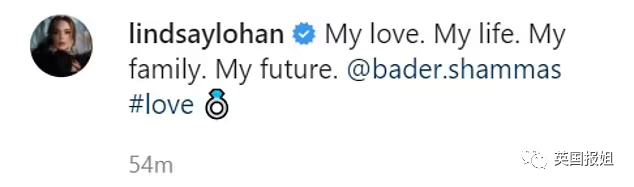 公布喜讯时她艾特了沙玛斯,并写道:“我的爱,我的人生,我的家人,我的未來。”,好像是认定了眼前的这个男人,甜蜜又开心。