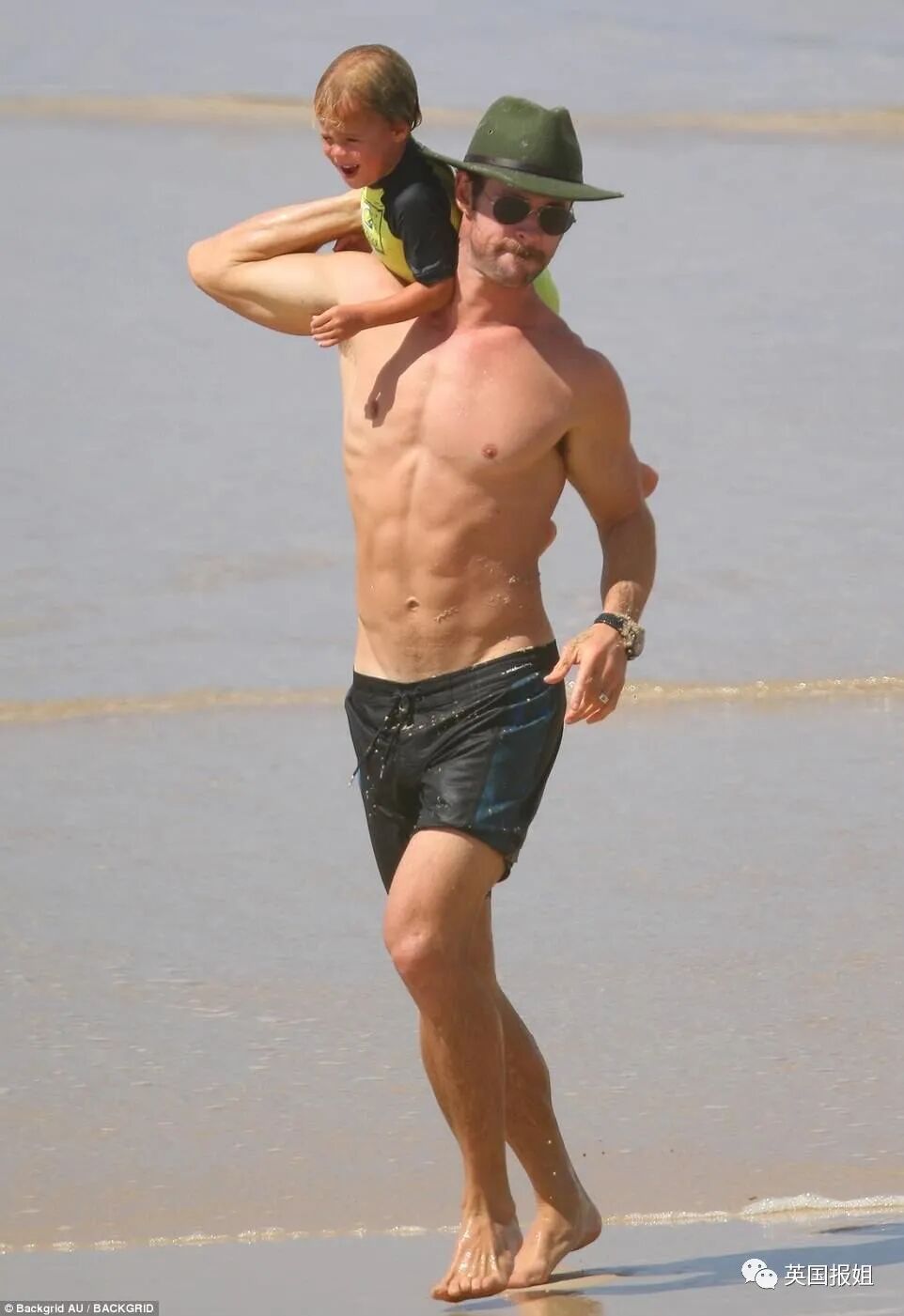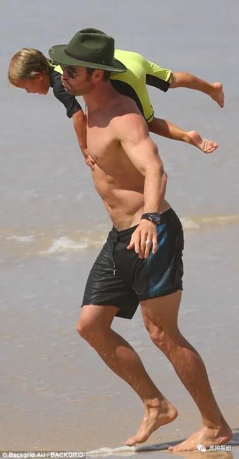 他还曾在海边和孩子对磕,其实是在做瑜伽伸展。