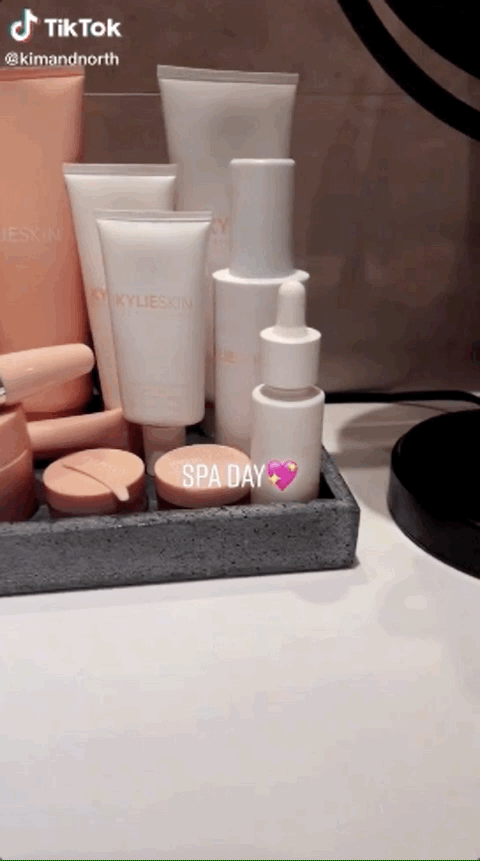 她最常拍的,是各种晒洗护用品的合集,里面有不少姨妈凯莉同名品牌的美妆护肤品: