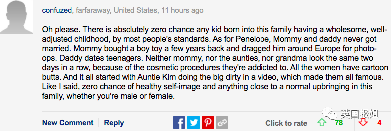 “拜托,这娃生在这种家里,根本没机会拥有一个和大众标准相符的温馨正常的童年。对于佩内罗普来说,爸妈从没结过婚。妈妈前几年‘买’了小男友,拖着他满欧洲拍照片,而爸爸只和少女约会。妈妈、姨妈们、外婆,因为执迷于整容手术,没一个看上去和两天前长一样。这家每个女人屁股都像卡通漫画似的。这一切都始于金姨妈拍的让一家人成名的视频。就像我说的,这家甭管男性还是女性,都没有任何健康的自我形象和正常的成长环境。”