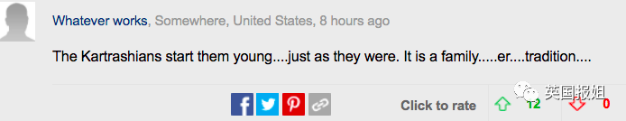 还有说“不是一家人不进一家门”的:“卡戴珊家族早早就推孩子出来了…就像以前(肯豆和凯莉)…这是家族传统。”