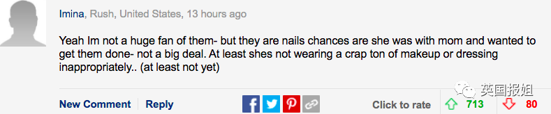 “我不是卡戴珊的粉丝,但是她做指甲可能是因为妈妈也在美甲所以也想试试,不是啥大事。她又没有化浓妆或者穿不合适的衣服(至少现在还没有)。”