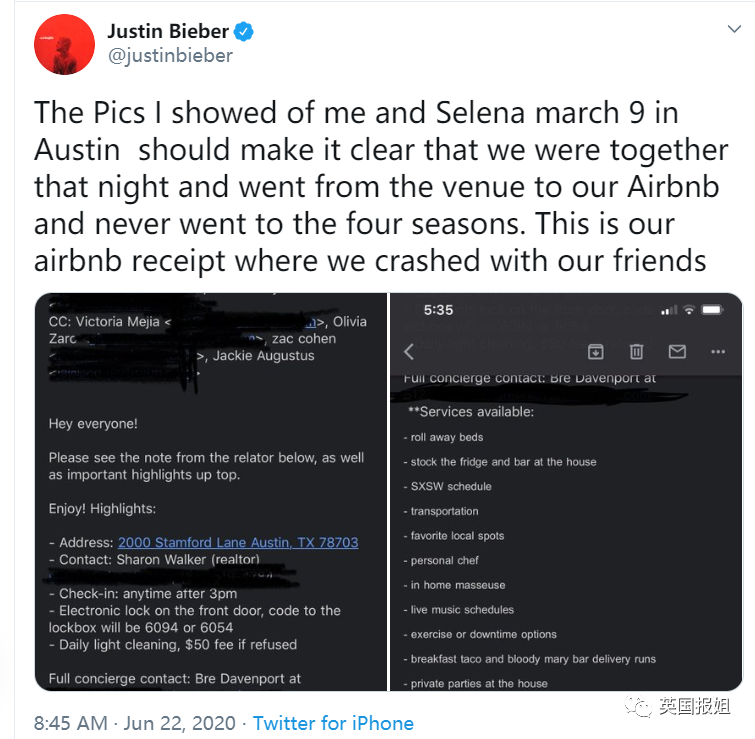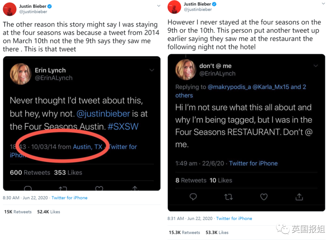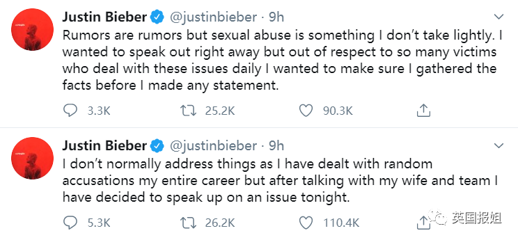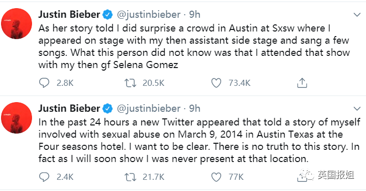 在事情发酵之后,贾斯汀比伯,连发了15条推特,来力争自己的清白……
