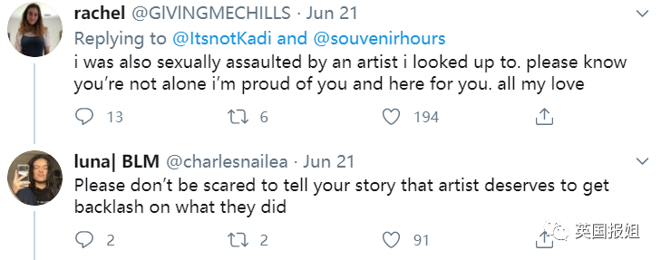 “我也被我仰望的艺人性侵。请知道您并不孤单,我为你感到自豪,爱你。”