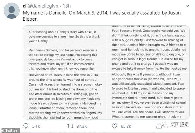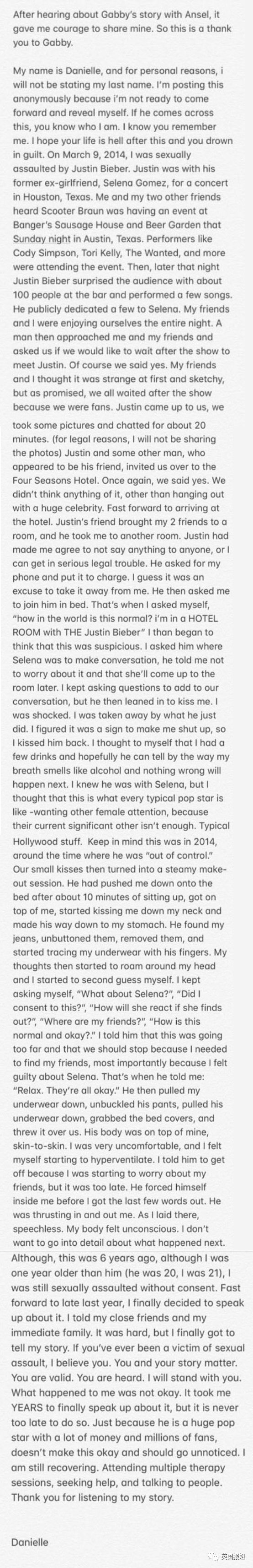 她在推特账户@danielleglvn上,发布了一篇长长的小论文,详细地描述2014年3月9日,人气小天王贾斯汀比伯,是如何性侵她的……