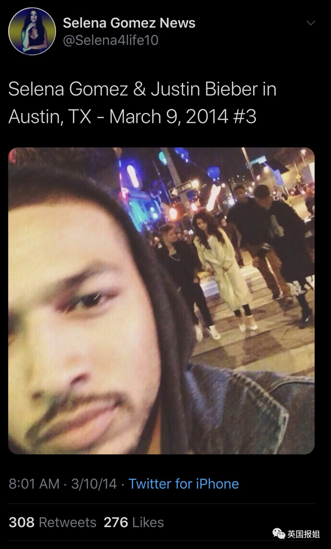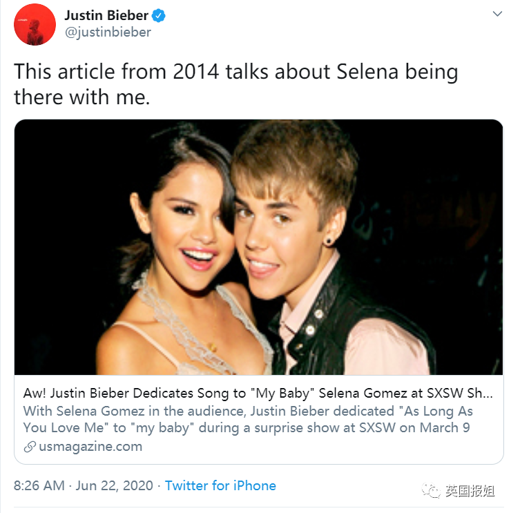 比伯发出来的这篇报道,发于2014年3月10日,标题为《比伯在舞台上为‘my baby’赛琳娜献上一曲》。