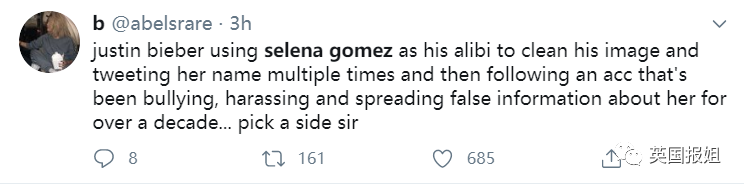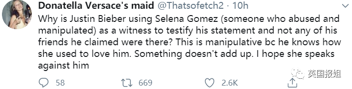 “为什么比伯的故事中明明有其他朋友,却一定要赛琳娜出来作证?这是操纵性的,因为他知道赛琳娜爱过他,我倒是希望赛琳娜站出来反驳。”