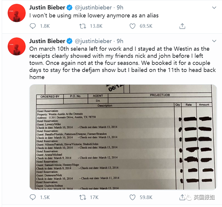 而图片中,他给出了3月10日酒店的预约入住及退房信息(其中,比伯本人化名为Mike)。