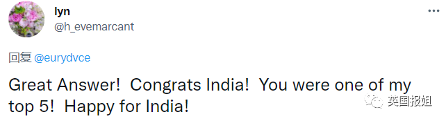 “很棒的回答!恭喜印度小姐!你本来就是我心里的前五名,替你开心!”