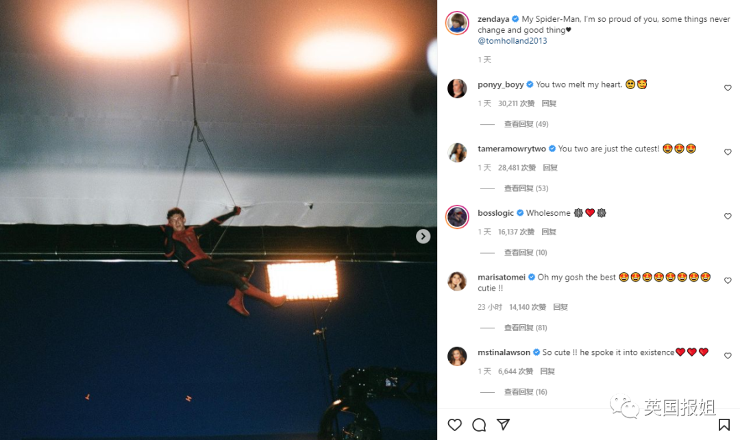 前几天又发了荷兰弟的片场照和他小时候扮演蜘蛛侠的童年照,直言自己为荷兰弟感到骄傲,还甜甜写上“我的蜘蛛侠”。