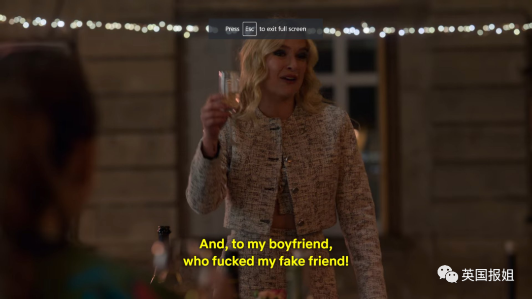 遭到好姐妹和男友双双背叛,卡米尔心里的怒火藏不住了,于是她举杯祝酒:“敬艾米丽,她确实在巴黎犯了很多错误。比如假装是我的好朋友,却和我的男友有一腿。顺便敬一下和我假朋友乱搞的男朋友!”