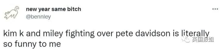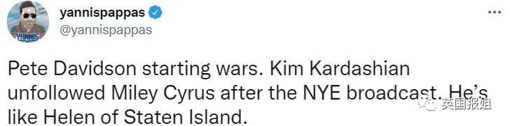 “皮特戴维森正在引发一场战争。金卡戴珊在新年夜特别节目之后取关了麦莉,皮特就像是史坦顿岛的海伦。”(特洛伊战争梗)