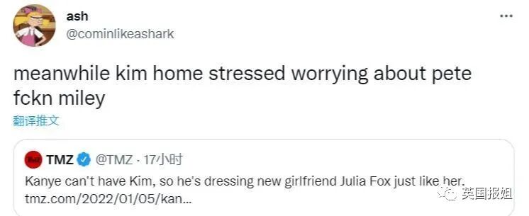 “金卡戴珊和麦莉抢皮特?笑死了!谁特么想要皮特啊!可怜的金,这里没有比赛!我真是抠掉脑壳都不明白皮特有啥吸引力。”