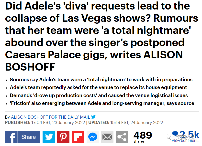 阿黛尔的“天后级”要求导致了拉斯维加斯演出的崩溃,有传言说和她的团队合作是一场彻头彻尾的噩梦。