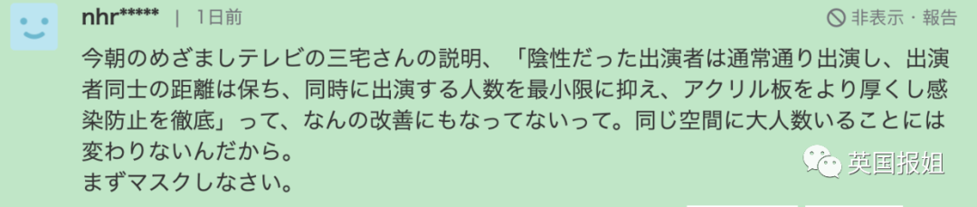 “今天早上节目里三宅桑说,只要核酸阴性的艺人在节目上保持距离,拍摄人数控制到最少,把透明隔板加厚就能继续演出,彻底防止感染。