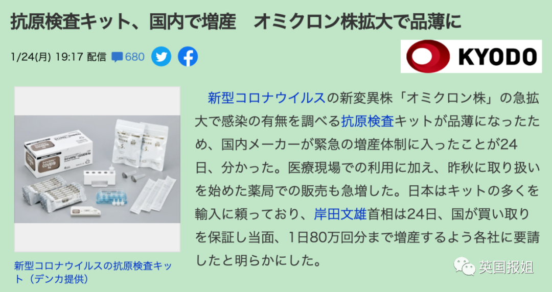 这是大实话。由于20日以来奥密克戎毒株的影响力扩大,导致日本试剂盒短缺,国内厂商虽然已经加紧赶制,但还是无法满足不断扩张的疫情。
