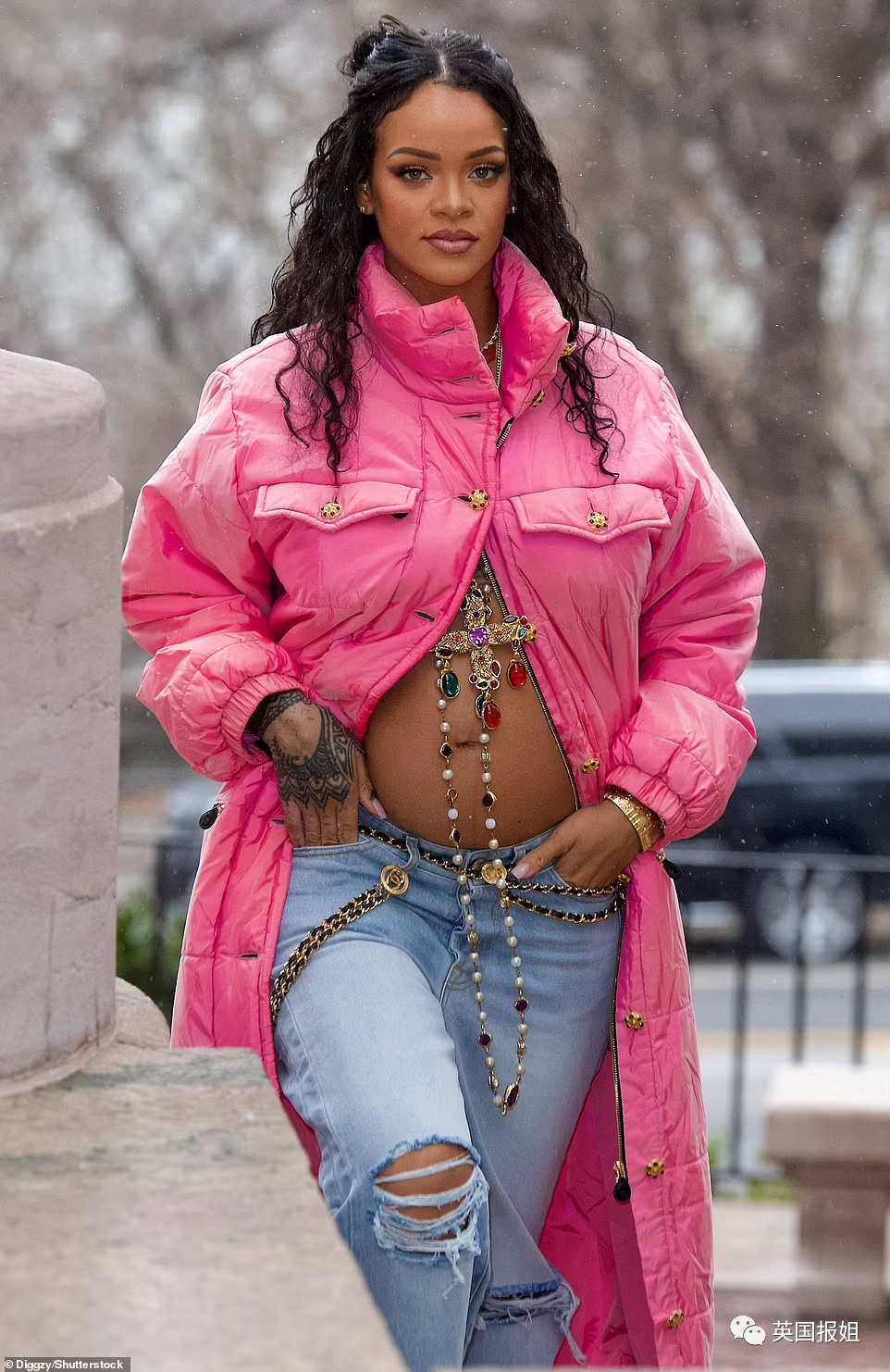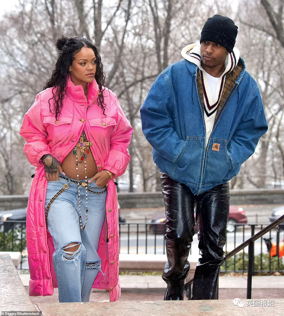 尽管天气寒冷,但蕾哈娜无所畏惧,只穿着一件外套,敞开大衣自豪地秀出孕肚。