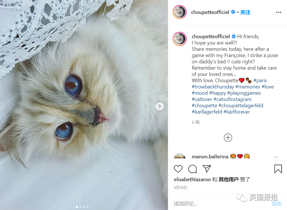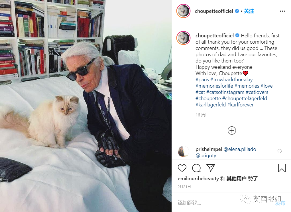 在这个INS上,除了舒佩特养尊处优的日常生活,还会定期分享和老佛爷相关的过去照片,表达自己的怀念。