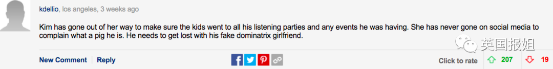 “金姐一直确保孩子们都参加他的试听会和任何他举办的活动。她此前从来没在社交媒体上抱怨过这只猪。他和新女友赶紧滚吧。”