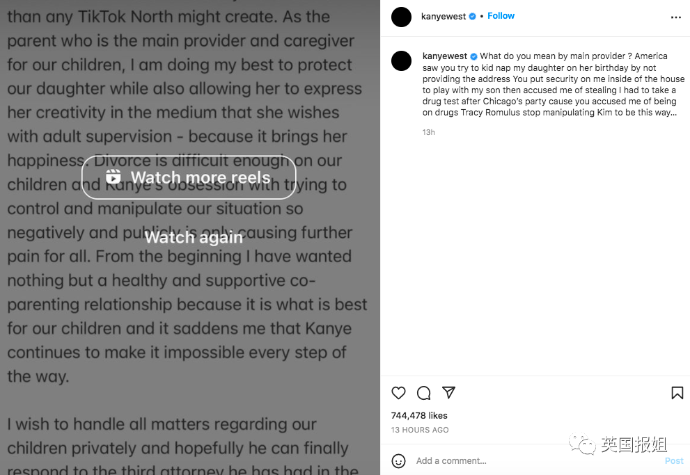 金姐第一次公开撕前夫的声明,和Ye爷日常情绪化无逻辑的只言片语对比起来,可以说是非常清晰有条理了。她回应了女儿小西北的Tiktok有成年人监管的问题,讲了前夫一直不断攻击她的事实,最后又透露了Ye爷在抚养问题上的拖泥带水不配合。