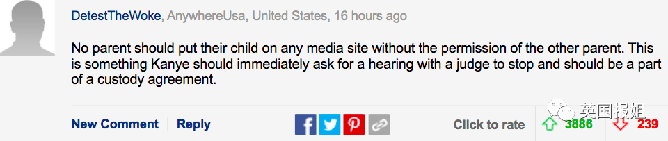 这位网友说:“任何家长都不能在未经另一个家长的允许下让孩子使用社交媒体。侃爷应该立刻上庭找法官停止这种行为,并写进抚养约定里面。”