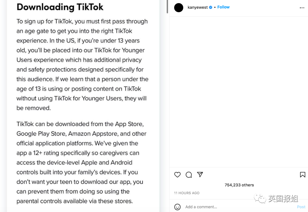 前任夫妻一前一后公开撕后,Ye爷后来又发了Tiktok的规章制度,特意截图了13岁以下未成年人的使用规定,以及应用商店不对12岁以下孩子提供下载的内容。简单一句话:咱家小西北,不准用!