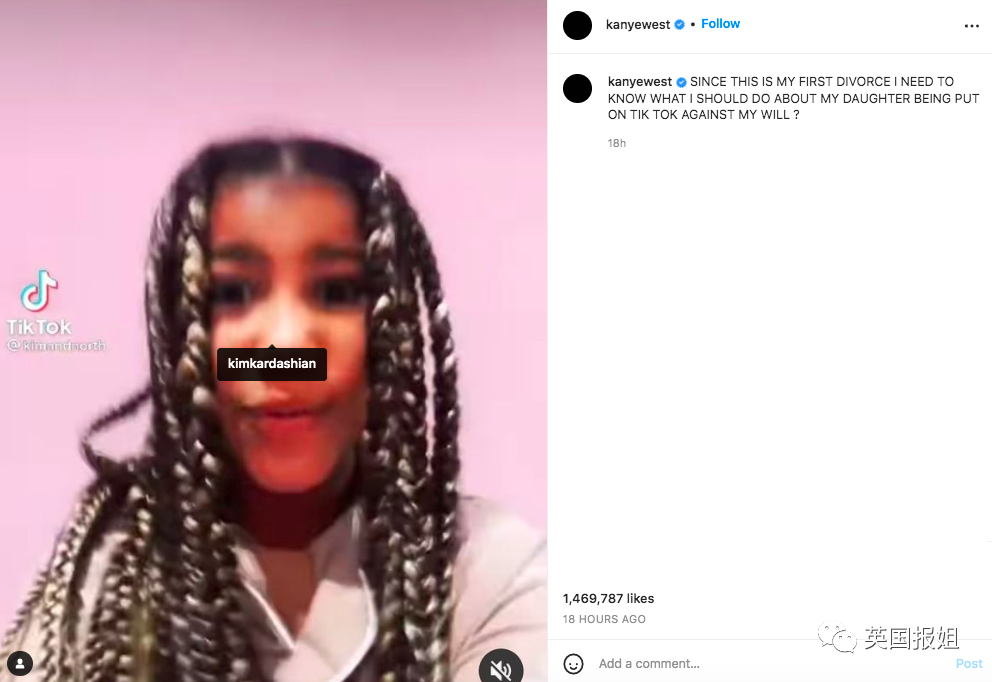 昨天,Ye爷在自己的社交媒体上传小西北的Tiktok视频截图,写道:“因为这是我第一次离婚,想知道女儿未经我允许用Tiktok这件事我该怎么办?”