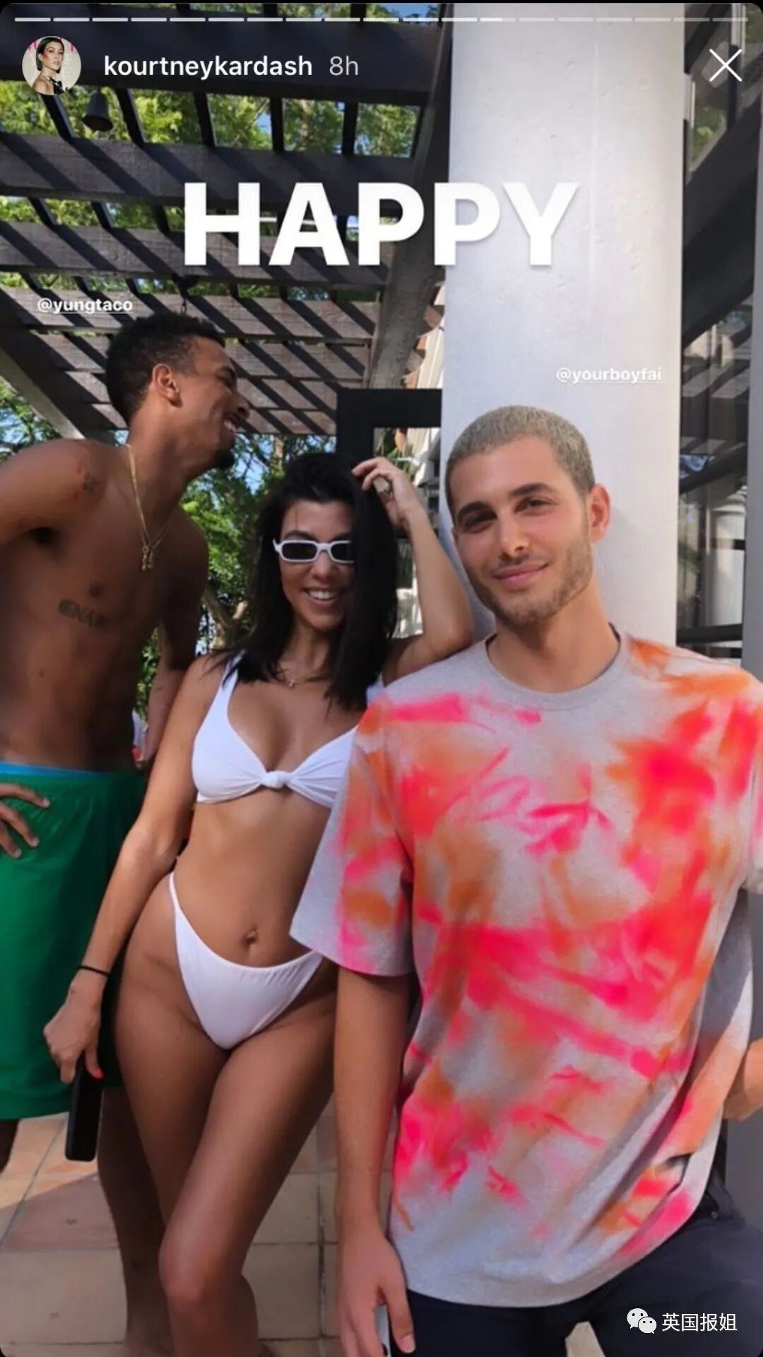 (肯豆发的度假照,写“最喜欢的男孩们”,最左为法依,最右为男友Devin)