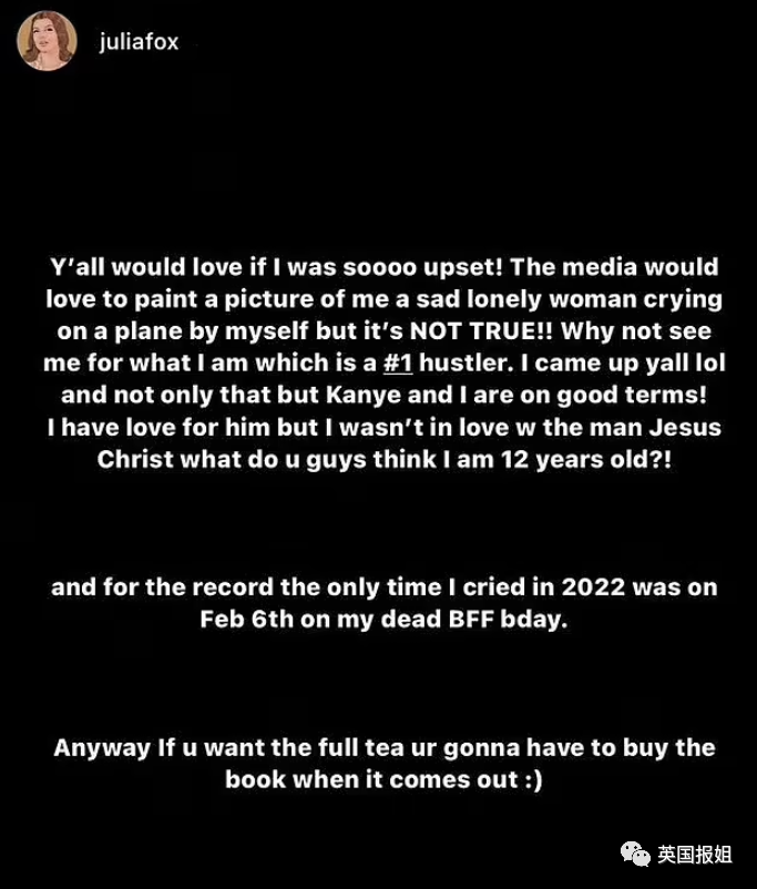 在声明的最后,她还暗示自己会写一本关于她和侃爷短暂情缘的书,虽然不知道这本书到底是不是真的会出,但除了出书挣钱以外,茱莉亚显然已经掌握了好莱坞的财富密码——流量到手,钞票我有。