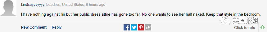 “我对蕾哈娜本人没有任何意见,但她在公共场合穿的服装风格都太过了。没人想看她半裸的样子,还是在自家卧室里这样穿吧。”