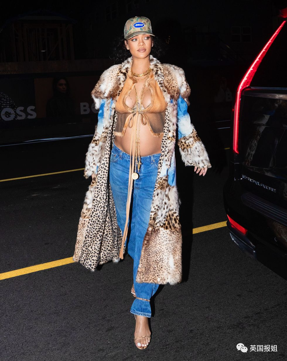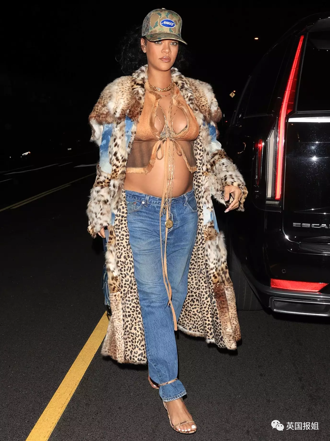 然后就是外出吃饭时被拍到的野性风穿搭,牛仔配露脐上衣,外面还披了件毛茸茸的豹纹印花大衣,完全把孕肚露了出来。
