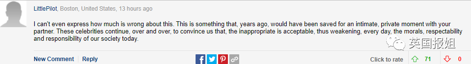 “我甚至无法表达这件事错得有多离谱。几年前,这样的事情本来应该是留给你的伴侣一个亲密的、私密的时刻。然而这些明星一次又一次让我们相信,不恰当的行为是可以接受的,所以当今社会的道德感、体面和责任感每天都在削弱。”