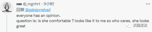 可问题在于:她自己感觉舒不舒服呢?在我看来她挺舒服的,所以谁在乎啊。她看起来超棒的。”