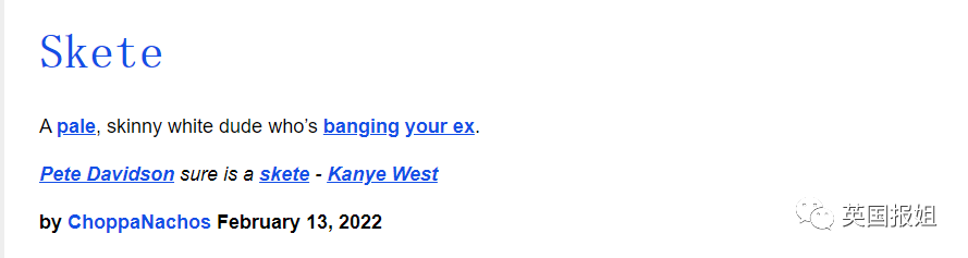 不管是哪种含义,在侃爷多次用这个词作为“情敌”皮特的蔑称之后,SKETE在如今的互联网世界里基本指的就是皮特戴维森了。