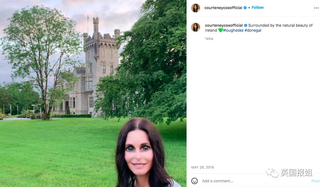 后来她还自嘲般地发了一张p图超严重的照片,配文写的“被爱尔兰的‘自然’美景环抱住啦!”
