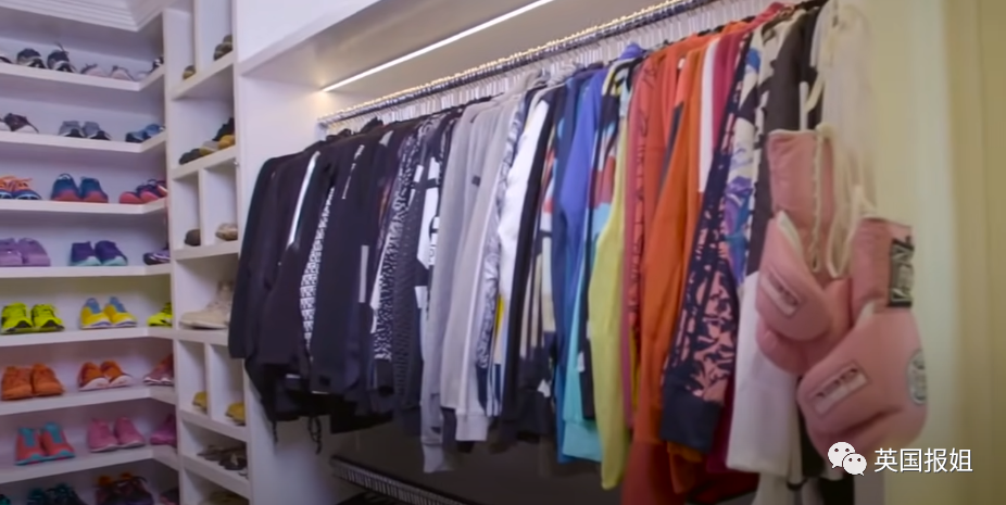 她的运动衣橱,顾名思义就是专门用来放运动相关衣服、装备的衣橱,包括运动衣、鞋、拳套。