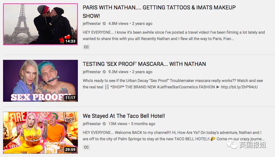 相识于微时,男友陪着J姐走过了许多创业难关,甚至从来不愿意出镜的他,也和J姐一起拍摄了很多化妆视频和旅行游记。J姐的频道搜索“boyfriend”关键词,能跳出许多内森参与拍摄的内容。