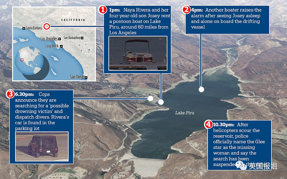 当人们救下孩子时, 才发现船上还有一件成人救生衣,和装有身份证件的包。这是《欢乐合唱团》中Santana的扮演者Naya Rivera的儿子,他告诉警察“妈妈去游泳了,一直没有回来。”