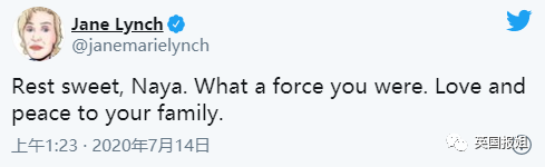 体育老师Sue:“好梦,Naya。你曾是一股多么强大的力量,希望你的家人得到爱与平静。”