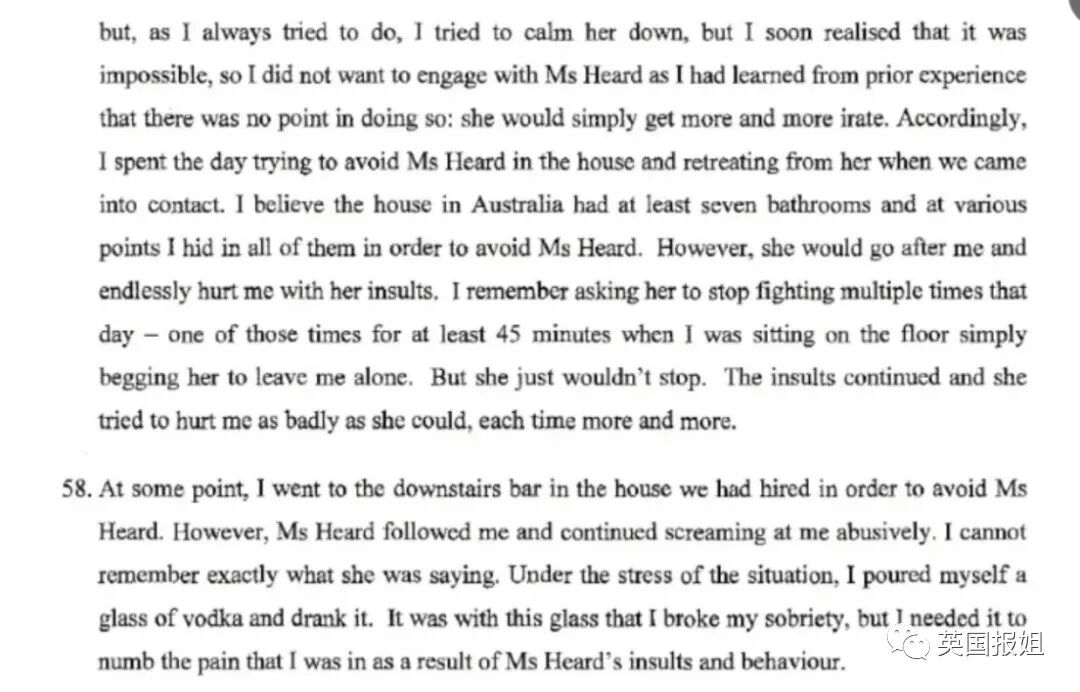 这之后德普仍在边喝酒边辱骂艾梅伯,想引起她的注意,但她还是不说话。于是艾梅伯称德普向她扔了靴子、叉子,最后因为药物和酒在洗手间昏了过去。