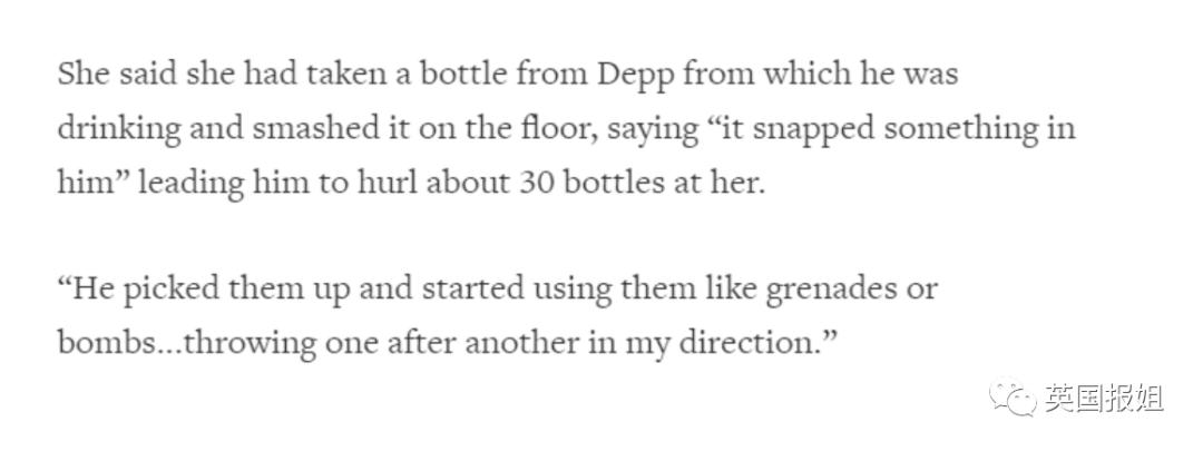 在毒品和酒精的作用下,德普开始捡起身边所有可触及的酒瓶,把30多个瓶子像扔手榴弹或炸弹一样砸向了她。