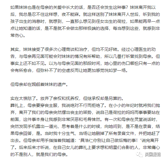 并且还披露出具荷拉在心理医生劝导下和母亲再次见面,可是母亲不仅没有给予女儿真情实感的关爱,反而在女儿尸骨未寒之时就惦念着财产,在葬礼上忙着录音、和明星合影。