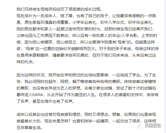 哥哥曾发布ins表示:原生家庭的环境很重要,自己和妹妹却从来没有依靠母亲、向母亲撒娇的机会。兄妹俩的童年极为辛苦,也极为孤独。
