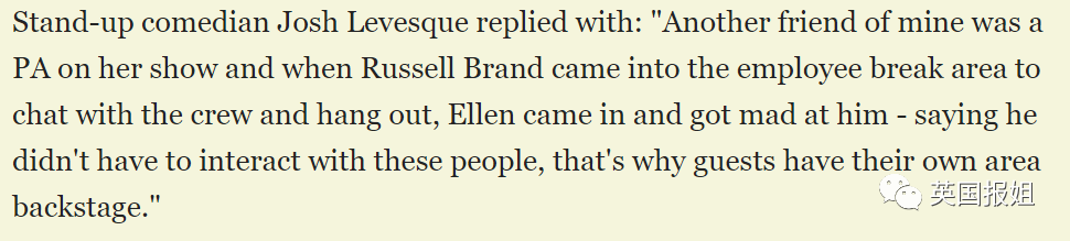 “我有一个朋友曾经是《艾伦秀》的制片助理。当时罗素·布兰德进入员工休息区,与工作人员聊天闲逛时,艾伦走过来,生气地对他说:你不必与这些人互动!