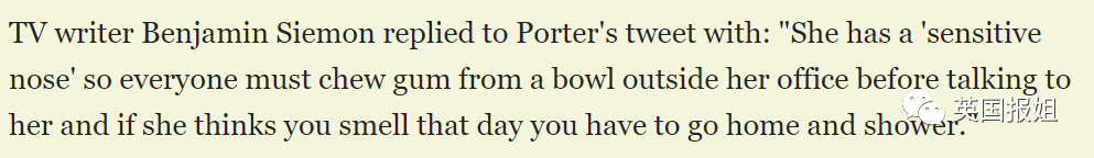 “她的鼻子非常敏感。所以所有人在进她办公室和她说话前都必须先嚼一块口香糖。