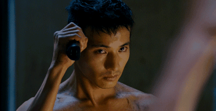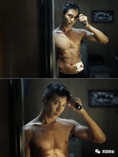 之后转型硬汉,饰演孤胆特工,在镜子前给自己剃头那段,简直苏断腿。