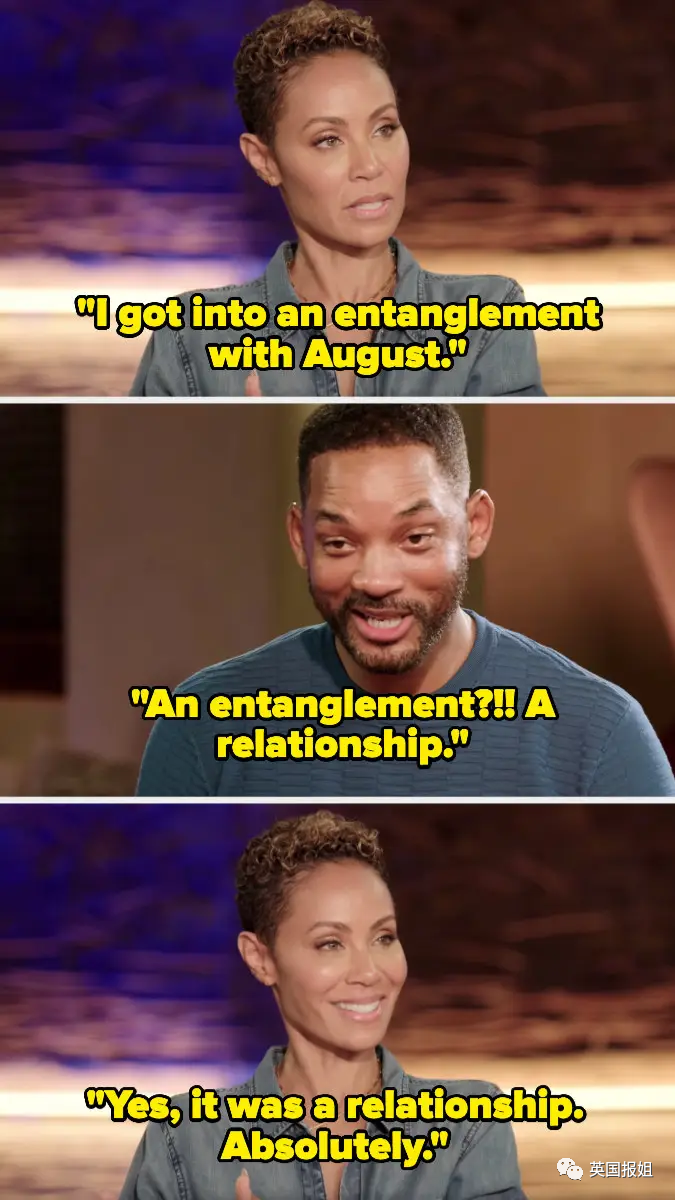 Jada说随着时间的推移,她对鲜肉歌手的感情发生了变化。但一开始她死活不用“出轨”或者“恋爱”这个词,而是这么表达她和鲜肉的关系:“我跟August有一些纠缠(entanglement)”
