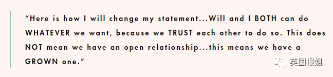 当时她这么描述两个人的关系:“Will和我在这段关系里可以想做什么做什么,因为我们相互信任。这并不意味着我们有一个开放的关系…这意味着我们有一个成熟的关系。”