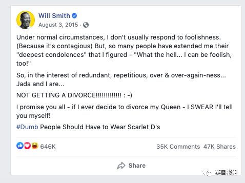 史皇出来否认,说和前妻离婚是他做过最糟糕的事,所以他绝对不会再和Jada离婚,还说那些爆料他们离婚的人愚蠢。