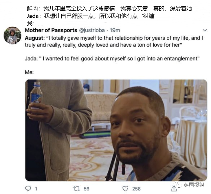 这感觉就是有点什么啊?一瞬间媒体就炸了,Will、Jada和August同时登上了推特热搜。一开始网友还觉得Will被戴绿帽子很惨,但出轨对象August告诉记者,Will早就知道了,不但没有生气,还祝福了他和Jada。